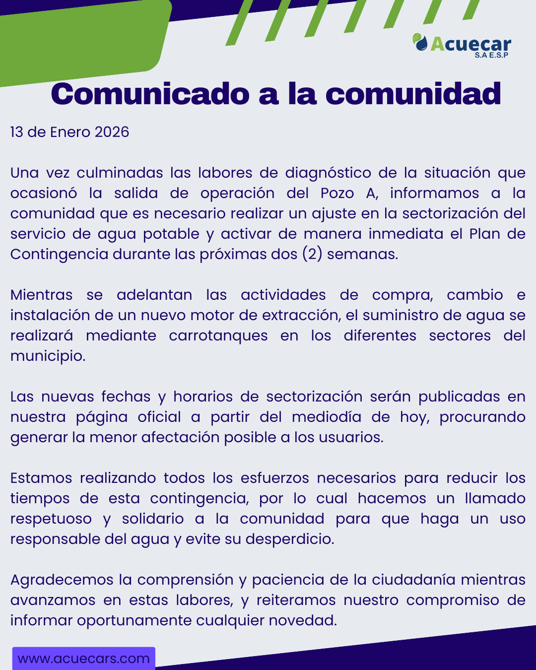 En septiembre de 2005 se dise帽贸 un plan de acci贸n con el apoyo del Gobierno Nacional (MAVDT), dentro del cual se estableci贸 la necesidad de crear una nueva empresa de servicios p煤blicos. Se defini贸 un plan de choque y en diciembre de 2005 se crea la empresa ACUECAR S.A. E.S.P., con el apoyo del Ministerio de Ambiente, Vivienda y Desarrollo Territorial.